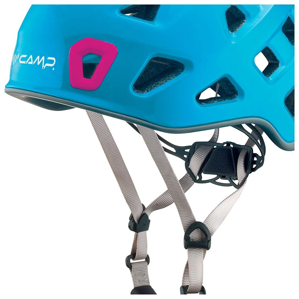 El casco de escalada Storm de Camp tiene un diseño In-Mold con carcasa de policarbonato y espuma EPS interna, combinando así ligereza y resistencia a los impactos. Está equipado con una rueda de regulación para un ajuste perfecto, así como con un separador lateral para un ajuste rápido. El acolchado interior extraíble hace que el casco Storm sea cómodo de llevar, mientras que los 22 orificios permiten una excelente ventilación. Un clip permite la fijación de un frontal.
