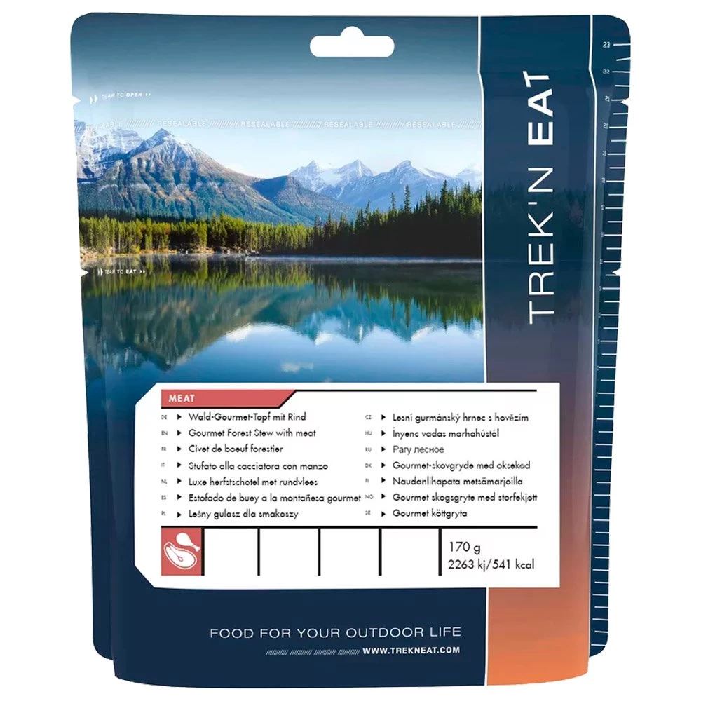 El estofado de ternera del bosque de Trek’n’Eat es una comida liofilizada compacta y muy ligera, perfecta para vivacs al aire libre. Con una larga vida útil, este delicioso plato es rápido de preparar y te aporta toda la energía que necesitas.