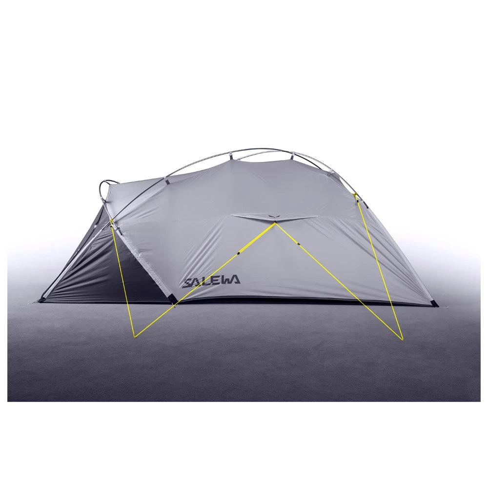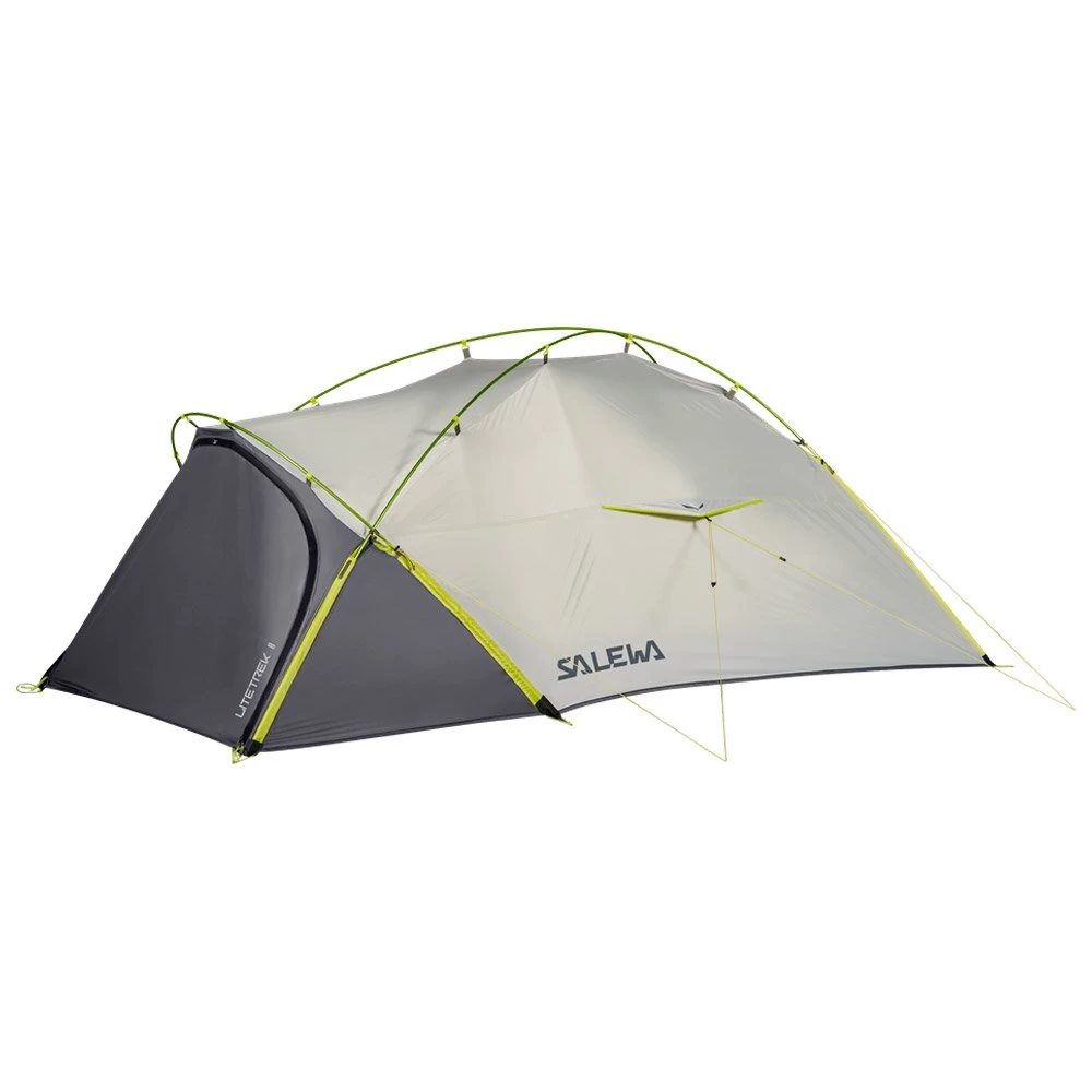 Ideal para acampar al aire libre en buenas condiciones, el modelo Salewa Litetrek II es una tienda para dos personas, diseñada para uso en tres estaciones. Ligero y compacto, también tiene un revestimiento de poliuretano impermeable en el doble techo y el suelo para protegerte de los elementos y resiste vientos de hasta 90 km/h. La superficie interior es de 2,52 m² con una altura de un metro y un ábside de 0,56 m² permite guardar enseres y cocinar. Un sistema de ventilación asegura una buena circulación del aire y la puerta con mosquitera evita la entrada de insectos. Se incluye una bolsa de almacenamiento con este modelo, así como un kit de reparación.