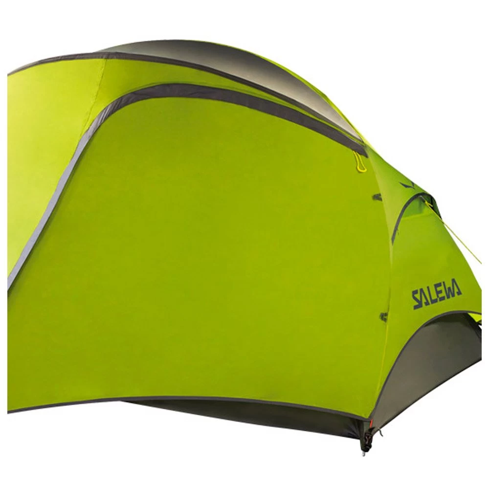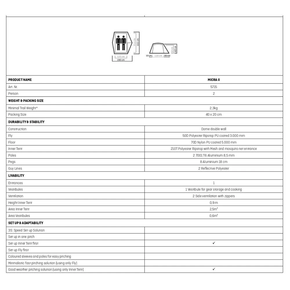 La Salewa Micra II es una tienda de campaña en forma de cúpula de doble pared independiente para 3 estaciones, ideal para los entusiastas del senderismo y el trekking. Con su gran capacidad de espacio interior (2,5 m²) y su robustez, la Micra II ofrecerá a una o dos personas, si no tienes mucho equipo, un cálido y acogedor refugio durante tu viaje. Equipada con un techo doble y con columna de agua de 3.000 mm., te ofrecerá protección contra las inclemencias del tiempo, una estabilidad superior contra el viento y una ventilación óptima. Está equipada con postes de aluminio que se montan rápidamente, tensores y cremalleras de alta gama y una entrada de malla con mosquitera. La Micra II también ofrece espacio para cocinar y almacenar equipos gracias a su ábside.